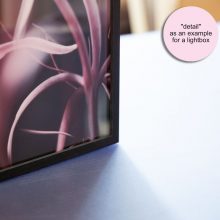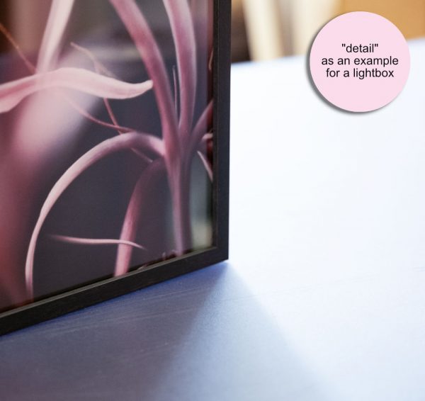 Die ausgewählte Fotografie (FineArt Print auf Backlightfolie) wird in einen offenporigen Holzrahmen mit Echtglasoberfläche gefasst und mit einer Aludibondrückplatte geschlossen.